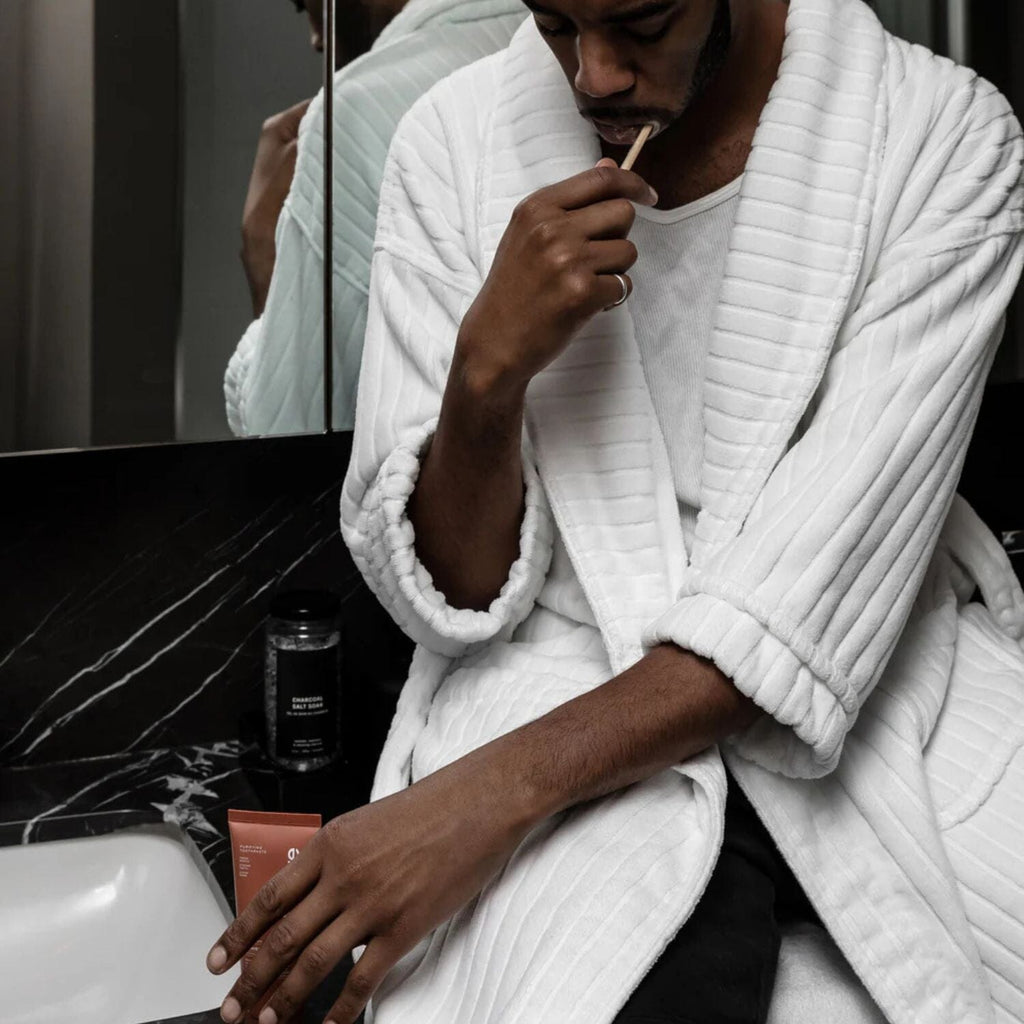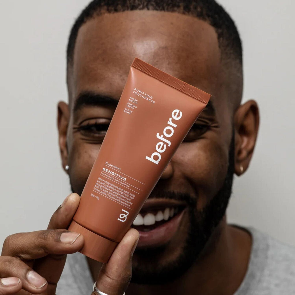 Breathe in and say goodbye to sensitive teeth. Before’s award winning natural Purifying Sensitive Toothpaste soothes unpleasant teeth and gum sensitivity with our custom blend of high-quality ingredients and sodium fluoride. Upgrade your brushing routine with our perfectly balanced foaming, soothing Supermint flavour and silky low-abrasion texture. Fight cavities, remineralize your tooth enamel, and level up your mouth health without harmful chemicals and synthetic ingredients.