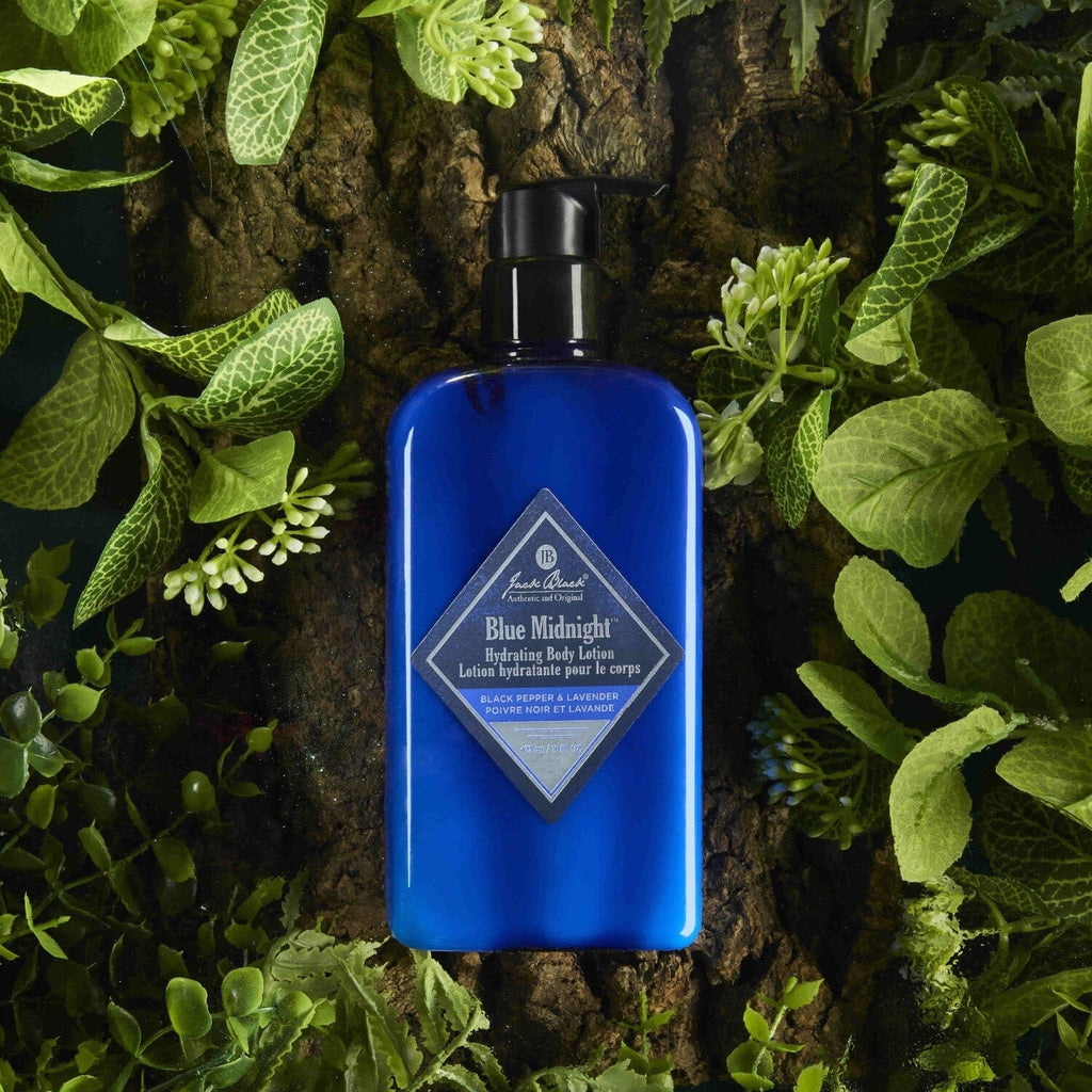 Black Pepper, a spicy, intriguing, masculine scent, melds with the soothing, complex, and compelling notes of French Lavender. Driftwood and Salted Amber contribute sun-soaked, mystical touches to create a seductive, hydrating lotion–a nod to the intrigue of the deep dark blue of midnight.