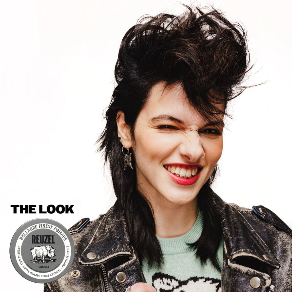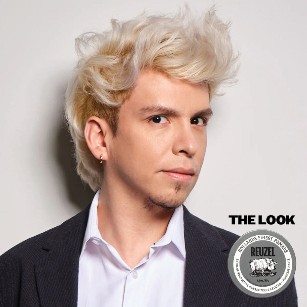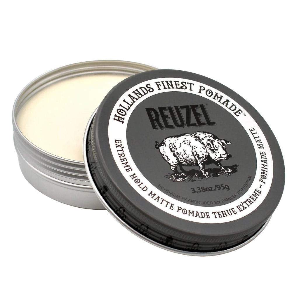 DIRECTIONS: Remove a small amount from the can and emulsify in palms. Apply product to towel dried or dry hair starting at the crown and working toward the front. Work scalp to ends and liberally coat hair to add texture. Use more Reuzel Extreme Hold Matte Pomade over any dry spots if necessary. Finish by styling hair into shape with fingers for a more textural style or comb for a cleaner, classic look.