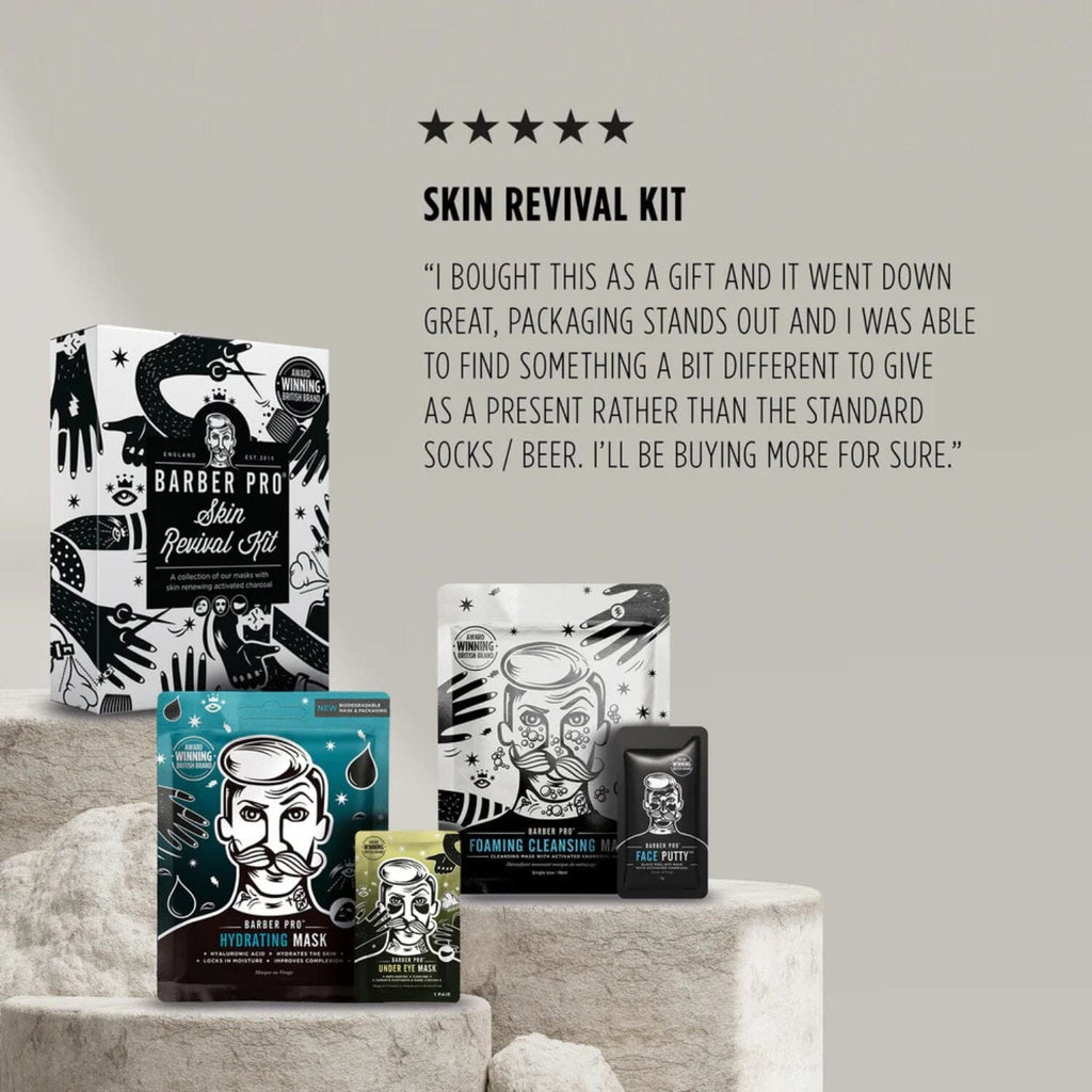 The BARBER PRO Skin Revival Kit is your go to solution for refreshed, clear and hydrated skin. This 4 step routine is designed to deeply cleanse, energize and restore, using results driven formulas tailored to male skin.