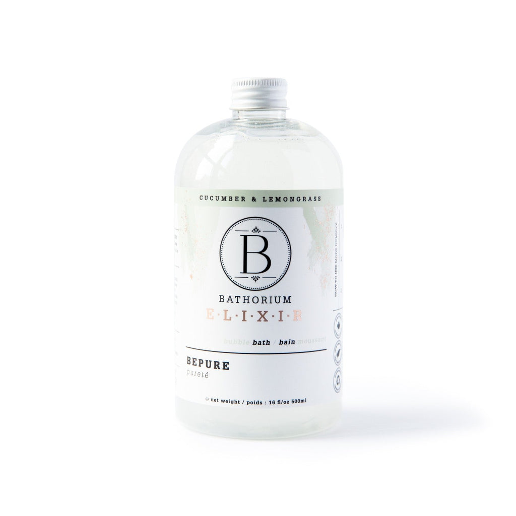 Neutral bubble elixir that pairs with any Bathorium bath bomb or crush varietal. Soft dewy cucumber water hydrates skin and lemongrass delicately grazes the entire body. Pure, clean and luscious bubbles.