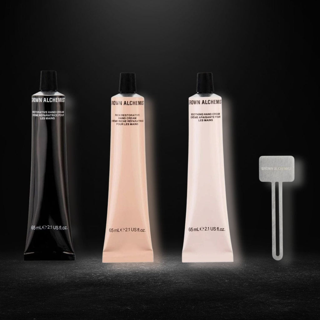A trio of Grown Alchemist's best-selling full size hand creams that give three levels of hand hydration. For every season, for every situation. Hands are moisturized and comfortable. Mix and match everyday hydration, soothing care and intensive hand cream relief. Includes a metal tube squeezer to ensure zero-waste.