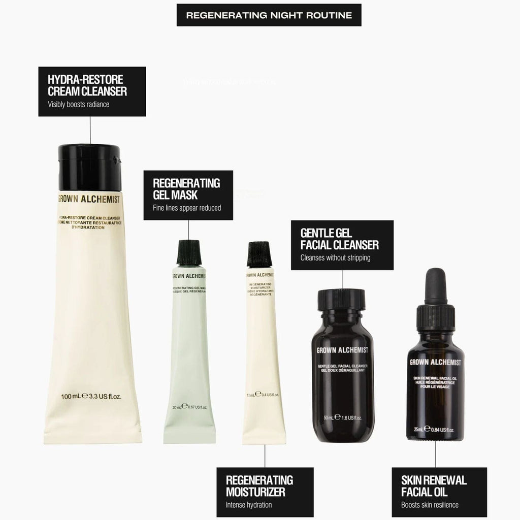 The ultimate night routine for restored skin, strengthened for longevity. Double cleanse with the nourishing Hydra Restore Cream Cleanser and Grown Alchemist's cleansing hero, Gentle Gel Facial Cleanser. The Regenerating Gel Mask cools and refreshes and works with the Regenerating Moisturizer to leave skin feeling firm, supple and plump with moisture. Finish with antioxidant Skin Renewal Facial Oil to nourish the skin barrier and leave skin with a healthy glow.