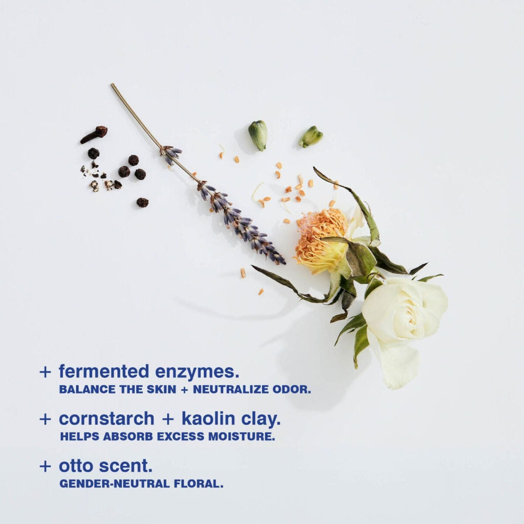 Cornstarch + Kaolin Clay absorbs excess moisture, keeping your underarms feeling fresh.
