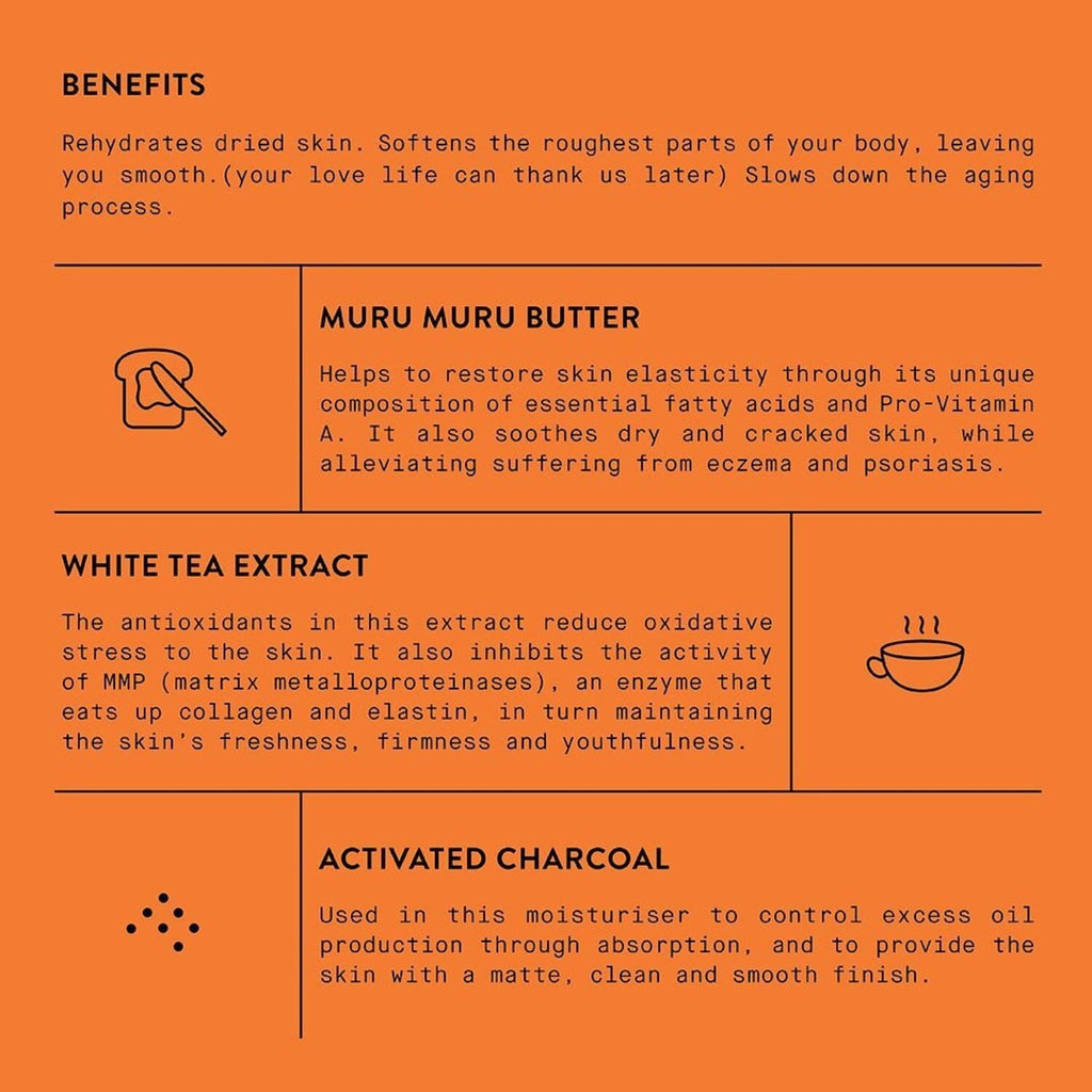 Grab your passport hairy legs, because we’re off on an adventure of a lifetime with ‘smooth’ flying conditions ahead. Imagine the skin on your body as the world map, most of which you’ve never traveled to (most). Pack your undies, socks and our rapidly absorbing, non-greasy body moisturiser and get ready to board. For entree we’ll be serving Muru Muru Butter, rich in essential fatty acids to restore skin elasticity, but won’t leave you slipping out of your seat. Coffee won’t be served today but antioxidant rich white tea extract will, which reduces oxidation damage and increases collagen production. Activated charcoal provides an unusual appearance but will leave your skin with a matte finish, perfect for all skin types. Welcome to your destination, you’ve never looked so good.