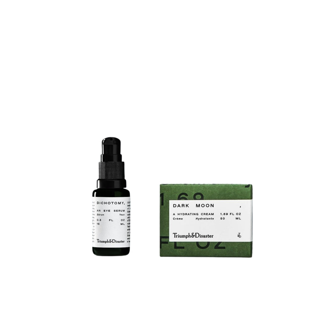 Essentials for your evening routine - The Night Set includes Triumph & Disaster Dichotomy Eye Serum and Dark Moon Hydrating Cream.