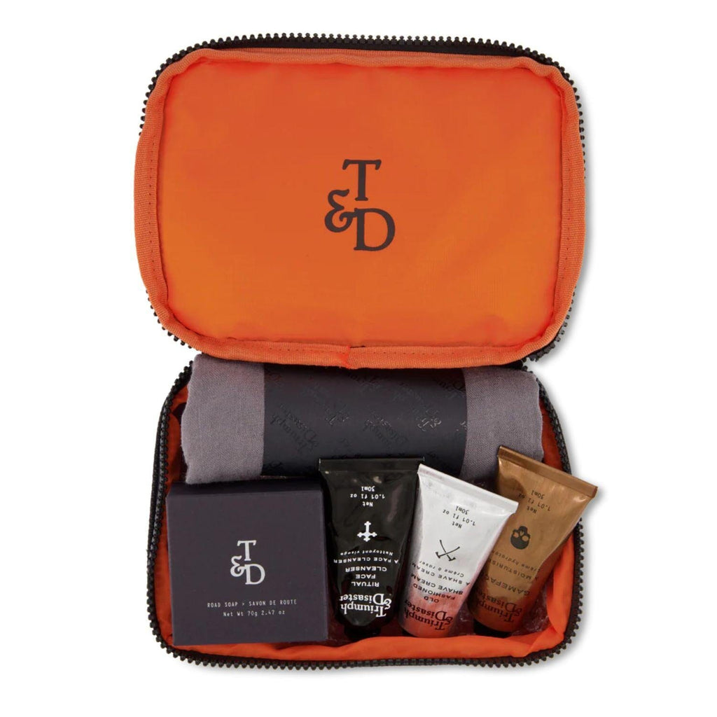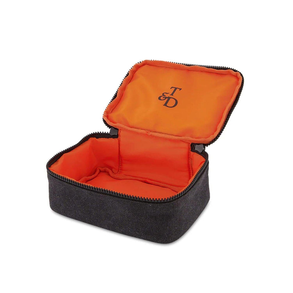 1 x Black Canvas Bag of joy. T&D's signature water-resistant orange lining protects your potions inside this toiletries bag. The wide clam-style zip opening lets you organise & access your entire range of supplies quickly plus the robust yet flexible canvas outer saves crucial space in your carry-on. L: 200mm x H: 80mm x D: 140mm approximately (8in x 3in x 5.5in)