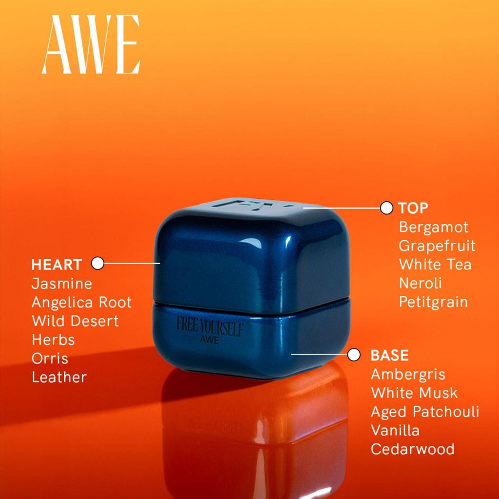 A luminous, radiant fragrance that refreshes and awakens. AWE combines vibrant citrus bursts of bergamot and grapefruit with calming notes of white tea, neroli, and jasmine, creating a scent that evokes clarity, freshness, and joyful perspective.