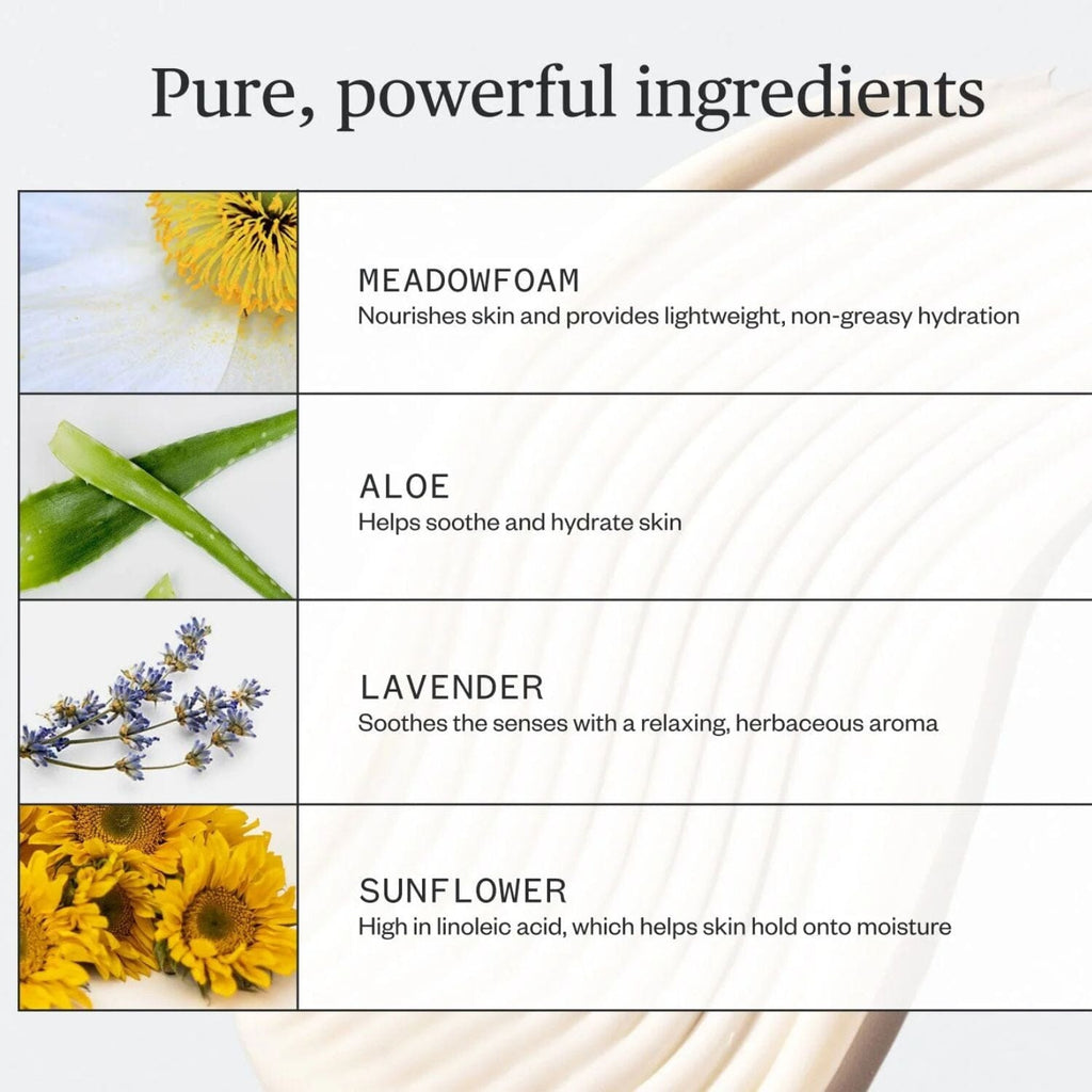 Soothes dry, dehydrated skin Known for their soothing properties, ingredients like Sunflower and Aloe help skin seal in moisture for super-nourished and softer-feeling skin.